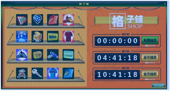 活动内容:活动期间内,格子铺设立3档抽奖,倒计时归0时,即可进行格子铺免费抽奖,格子铺为大家准备了精美大礼,欧冠勋章、欧冠之魂、银币兑换包(中)、限量积分、战术积分等超级幸运奖期待你来抽取哦~分秒必争的你,如果不堪忍受等待之苦,也可以立即花一定量的金币进行抽奖哦!每日每人抽奖次数有限,机会难得哦!