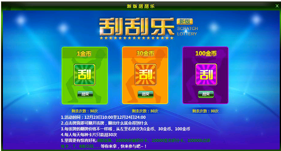 2、每人每个活动日刮奖有次数限制。标价1金币的牌每人每个活动日限刮30次;标价30金币的牌每人每个活动日限刮30次;标价100金币的牌每人每个活动日限刮30次。