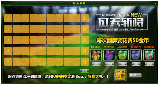 活动内容:在活动期间内,玩家参与“过关斩将”活动。过关斩将好玩的不得了,该活动从入口开始翻牌,每翻一张牌仅需50金币,如果翻出的是道具可直接获取,如果是拦截球队则要战胜这支球队或者消耗200金币跳过这支球队才能继续翻牌。成功闯关的玩家能够领取闯关大奖礼包咧,5关全过就可以冲击大奖,就可以挑战终极BOSS,如果挑战成功则可以领取“过关斩将大宝箱”哟~1-8级合同、训练卡100000点*5、袖标6级、立即返回卡*10等你拿!