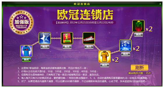 活动内容:在活动期间内,让我们一起涌入“欧冠连锁店”吧,界面中依次有7家店铺,每家店铺都出售一种道具。玩家按照店铺顺序购买,1号店道具免费购买喔~剩下的店铺需使用金币(活动券)购买道具。每人每天能购买35次呢~如果你对上架的道具不满意,还可以消耗5000银币刷新哟,说不定能刷出更好的道具呢~