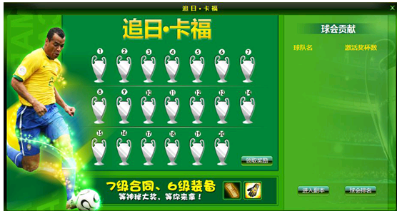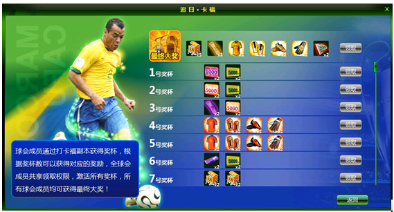 3、球会成员每通关一次卡福副本,即可随机获得某号码奖杯,每一个奖杯对应一个大奖,当所有奖杯都点亮,球会中符合领取条件的成员均可领取最终大奖。奖励每人限领1次。