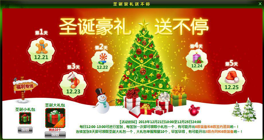 活动内容:在12月21日-12月25日每日12:00-13:00点击活动页面即可进行签到,每签到一次就可以领取一个小礼包,如果连续签到5天(不可补签),在圣诞节当天领取圣诞大礼包一个。