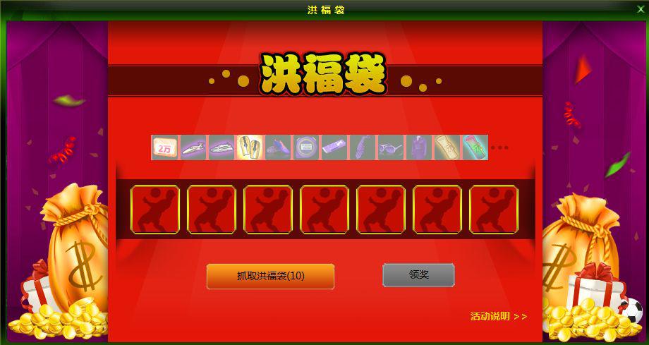 活动内容:活动期间内,快来“抓取洪福袋”!仅需30金币就可以开启洪福之旅,抓得洪福袋点亮道具奖励,更有8级合同,欧冠之魂,6级高教装备等等N多豪礼呢~心动不如行动,快来抓洪福袋!