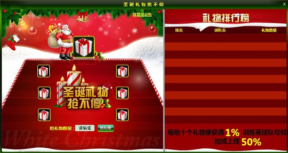 1、玩家每抢一个礼物需消耗1金币。当玩家每抢10个礼物就会有训练场球队经验加成1%的奖励,累加至50%封顶。