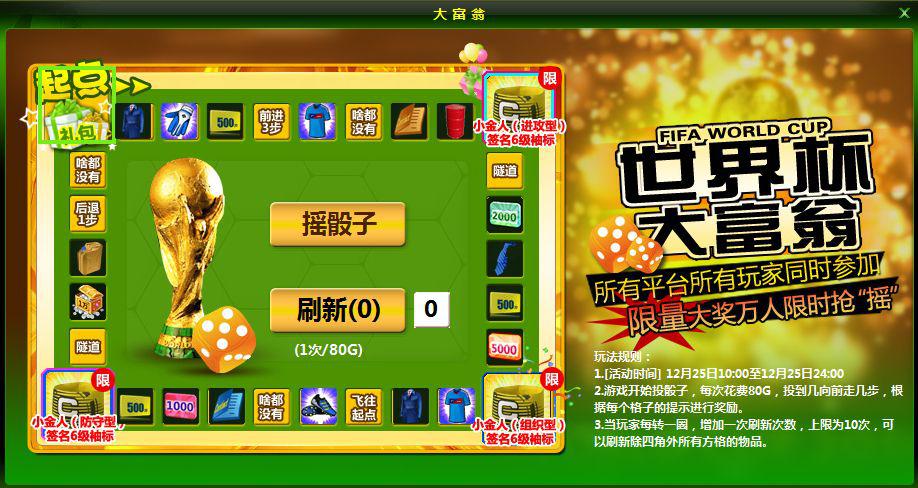 活动内容:在“世界杯大富翁”活动期间内,您仅需消耗80金币即可掷1次骰子,骰子显示几点就走几步。在世界杯大富翁之路上,除了有起点礼包,更有全区全服限量投放的小金人前锋6级签名袖标,小金人中场6级签名袖标,小金人后卫6级签名袖标哟! 全区全服限量的超级大礼,你一定不能错过机会。
