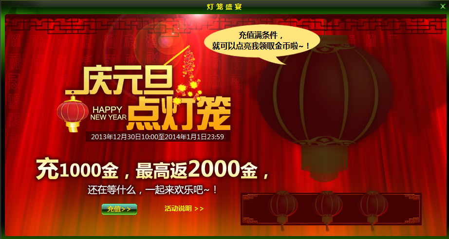 1月1日0:00-24:00玩家单笔一次性充值大于等于1000金币可点亮第三个小灯笼;