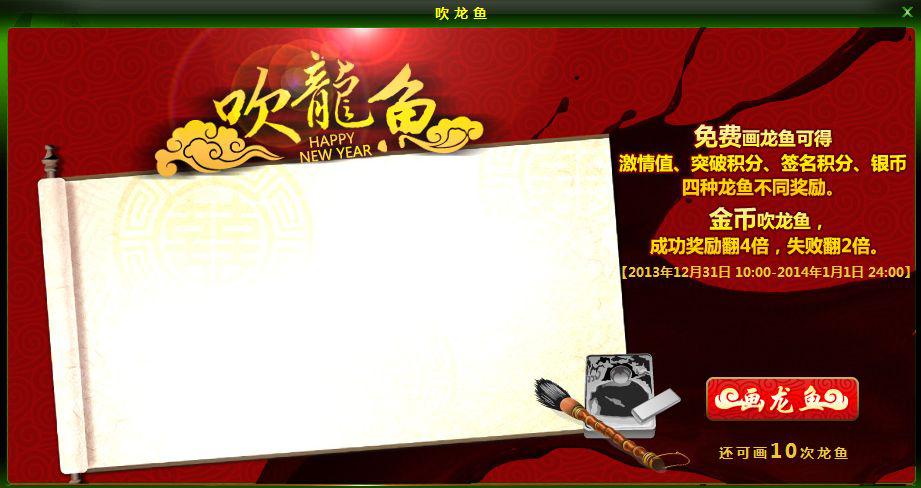 活动内容:活动期间,玩家画龙鱼可获得激情值、突破积分、签名积分、银币,画完龙鱼后,玩家可选择性的花费金币进行吹龙鱼,若玩家吹龙鱼成功则奖励能翻4倍,若玩家吹龙鱼失败则奖励也能翻2倍哟~吉祥龙鱼,要为你掀开新年大喜哟~快来参与吧!