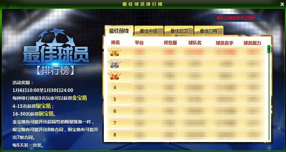 活动内容:在活动期间内,玩家免费报名参与“最佳球员排行榜”活动,将自己球队的球员任选1名进行培养,选择培养的球员能力将形成排行榜。活动每3天为一个奖励周期,排行榜前30名的玩家将会获得丰厚的奖励,前3名奖励金宝箱呢~而金宝箱有可能开出超属性的限量装备一件哟~让我们来比试比试吧!