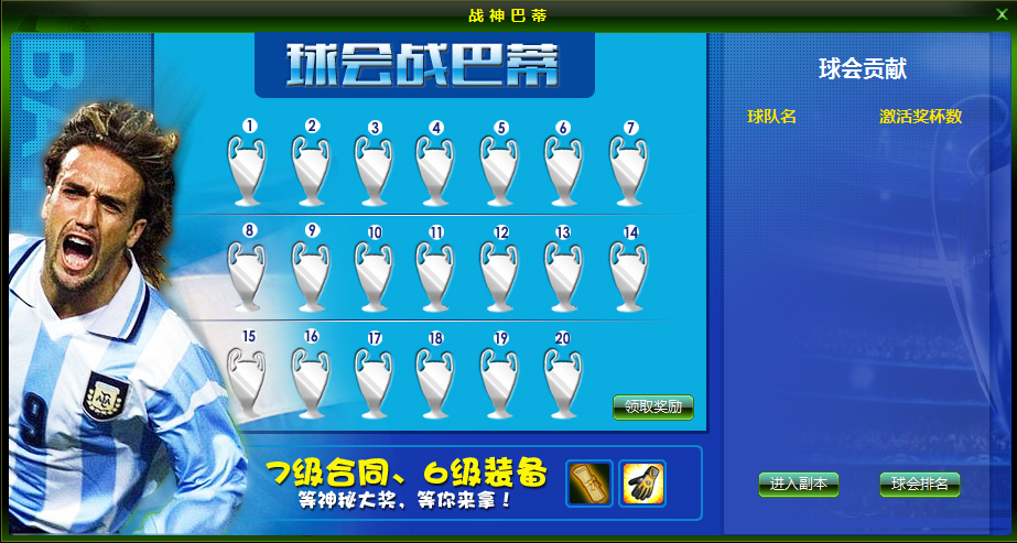 活动内容:“球会战巴蒂”本活动以球会为单位进行,球会成员每通关一次巴蒂副本可随机获取并点亮一个对应号码的奖杯,此时球会成员可领取一次对应号码奖杯的专属奖励,更值得期待全部奖杯点亮时的最终大奖呢!奖励领取次数有限,快与战神同福享!