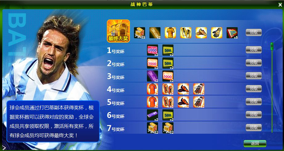 2、 球会成员每通关一次巴蒂副本,即可随机获得某号码奖杯,每一个奖杯对应一个大奖,当所有奖杯都点亮,球会中符合领取条件的成员均可领取最终大奖。奖励每人限领1次。