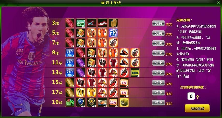 9球奖:欧冠之魂*2,合同5级*4,银币兑换包(中)*5,4级护腿*4,4级战袍*4,4级战靴*2,4级手套*2。每人每天可兑换3次。