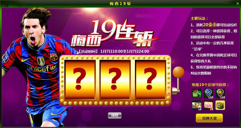 活动内容:在活动期间内,大家都来体验梅西19连斩那其乐无穷的游戏环节吧。玩家只需消耗20金币就可拉动一次摇杆,你就有机会获得相当丰厚的幸运道具或装备呢~