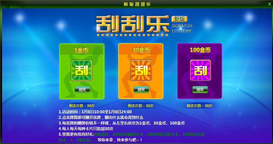 2、每人每个活动日刮奖有次数限制。标价1金币的牌每人每个活动日限刮30次;标价30金币的牌每人每个活动日限刮30次;标价100金币的牌每人每个活动日限刮30次。