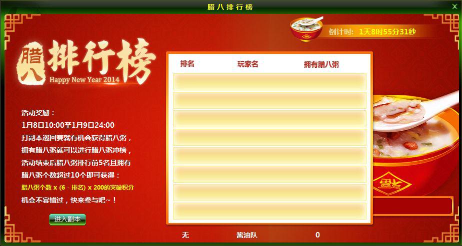 活动内容:活动期间,玩家通过打巡回赛副本就有机会获得腊八粥,拥有腊八粥就可以进行腊八粥冲榜。当活动结束之后,腊八粥排行榜前5名且拥有腊八粥个数超过10个即可获得腊八粥个数*(6-排名)*200的突破积分哟,机会不容错过,快来参与吧!