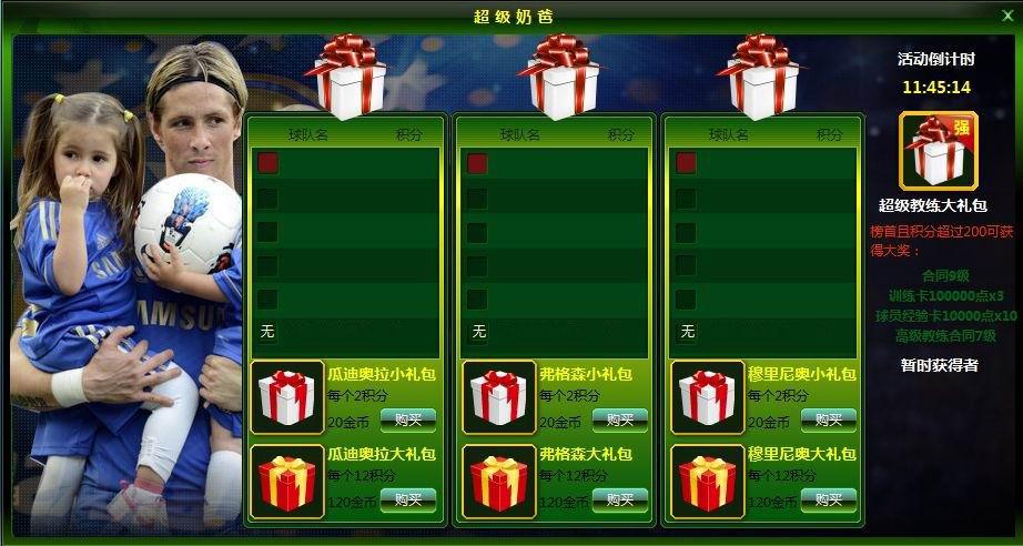 活动内容:在活动期间内,参与“超级奶爸”活动的玩家在购买三位教练的大/小礼包时不仅可随机获得诸多道具装备,购买礼包的同时还可获得积分呢~在活动截止时每位教练栏中积分榜第一者且积分超过200分可获得超级教练大礼包哟~~里面藏着合同1-9级,训练卡100000点*3,球员经验卡10000点*10,高教合同8级呢~