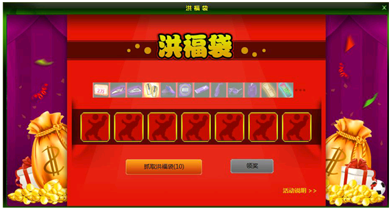 1、每抓一次洪福袋需消耗30金币,每天每人最多可摘10轮洪福袋。