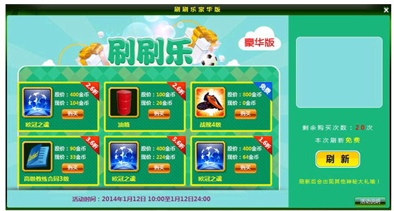 1、活动开启后,玩家点击“刷新”按钮可刷出6款随机道具及随机折扣,玩家有可能刷出免费购买道具的机会。