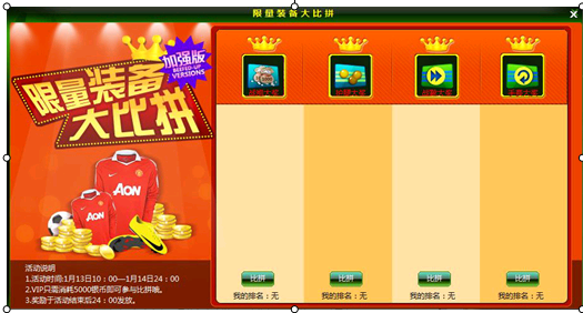 1、只有VIP功能玩家才可报名参与限量装备大比拼。活动分为2天,第一活动日为: 1月13日10:00—24:00。比拼内容为6级限量装备的排名。第二活动日为:1月14日0:00-24:00,比拼内容为7级限量装备的排名。