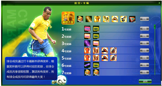3、球会成员每通关一次卡福副本,即可随机获得某号码奖杯,每一个奖杯对应一个大奖,当所有奖杯都点亮,球会中符合领取条件的成员均可领取最终大奖。奖励每人限领1次。