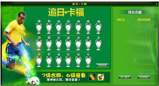 活动内容:“追日-卡福”活动以球会为单位进行,球会成员每通关一次卡福副本可随机获取并点亮一个对应号码的奖杯,此时球会成员可领取一次对应号码奖杯的专属奖励,更值得期待全部奖杯点亮时的最终大奖呢!奖励领取次数有限喔~大战来临,快拿出卡福的状态来!