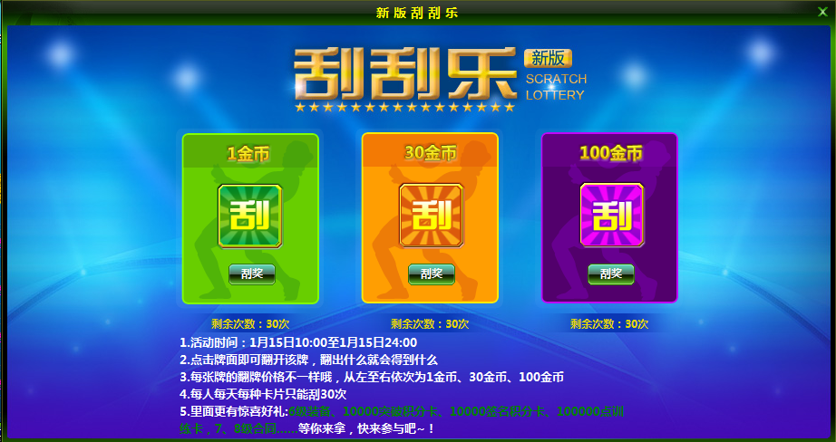 2、每人每个活动日刮奖有次数限制。标价1金币的牌每人每个活动日限刮30次;标价30金币的牌每人每个活动日限刮30次;标价100金币的牌每人每个活动日限刮30次。