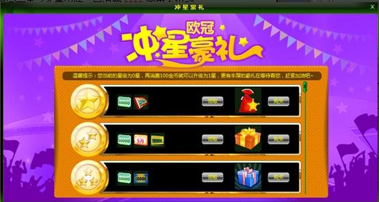 活动内容:在活动期间内,玩家通过消费金币达到不同的星级,可领取及购买相应星级大礼。身为VIP或单日消费满100金币即可品尝一星之礼美滋味。日消费6666金币不仅能领取6星礼及抢购6星礼包,并有满星大礼包呈献!