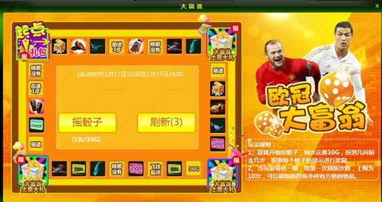 2、在界面的四角方格中,大礼尤为丰富哦。如玩家完成一圈刚好落在起点格上会获得起点礼包,内含:重翻次数卡*5,银币兑换包(中)*5,欧冠之魂*10,球员经验卡5000点*5、训练点10000*10。起点礼包单服最多可领取6个,内含的道具材料将会直接发放到玩家背包中,请注意查收。