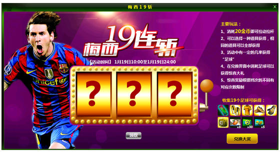 活动内容:在活动期间内,大家都来体验梅西19连斩那其乐无穷的游戏环节吧。玩家只需消耗20金币就可拉动一次摇杆,你就有机会获得相当丰厚的幸运道具或装备呢~