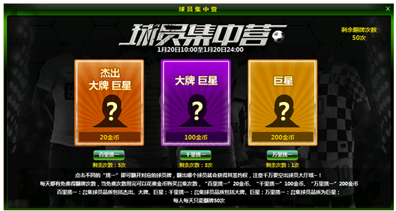 活动内容:在活动期间,“球员集中营”惊喜送上!玩家可有免费的机会在“百里挑一”、“千里挑一”、“万里挑一”翻牌获得随机品质球员的签约权。令你百感交集的球员集中营让你挑上瘾,每天免费挑选的次数可有限,欲罢不能时花点金币也可以挑!杰出,大牌,巨星球员要来验验你的手气了!