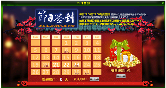 活动内容:在活动期间,玩家每天在22:00-24:00在活动页面中进行签到,每签到一次就可以领取世界杯积分卡500点,每签到1天就累计1天,1月23日当天可以领取到500世界杯积分卡*签到累计天数。如果连续签到至活动结束,还可以领取节日连签礼包呢!一定不要忘记连续签到哟,签到活动是不可以补签的~