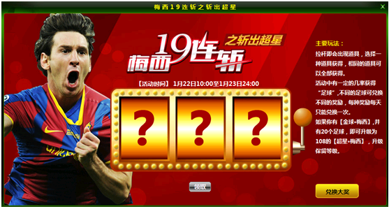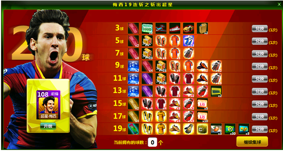 活动内容:在活动期间内,大家都来体验梅西19连斩那其乐无穷的游戏环节吧。玩家只需消耗20金币就可拉动一次摇杆,你就有机会获得相当丰厚的幸运道具或装备呢~你更有机会获得足球,集足球可以兑换不同奖励,当玩家在活动期间集齐20个足球就可以将金球·梅西升级为初始能力108的超星·梅西哟!
