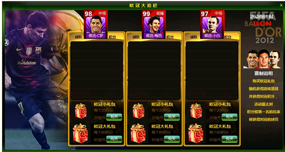 活动内容:活动期间内,在活动界面内购买礼包,不仅可随机获得合同、教练合同、球员经验卡、教练经验卡、战靴、欧冠之魂等道具材料,购买礼包还可获得积分,活动截止时积分榜状元可获得金球候选大牌哟!不要忘了拥有三位候选大牌可以合成初始能力105巨星金球梅西哦~^_^