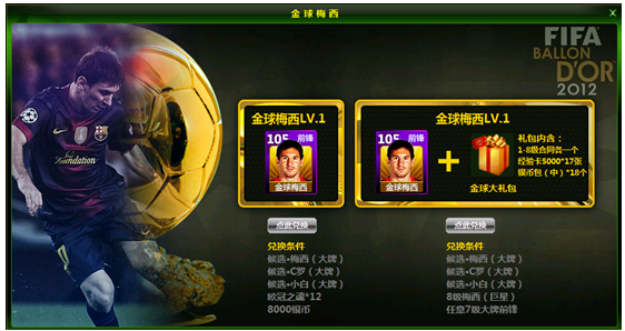达到兑换条件后,点击兑换按钮即可获得初始能力105巨星金球梅西+金球大礼呢!得到欧冠大礼包,你就可以让初始106巨星欧冠C罗瞬间提升级别实力,的确很强悍!