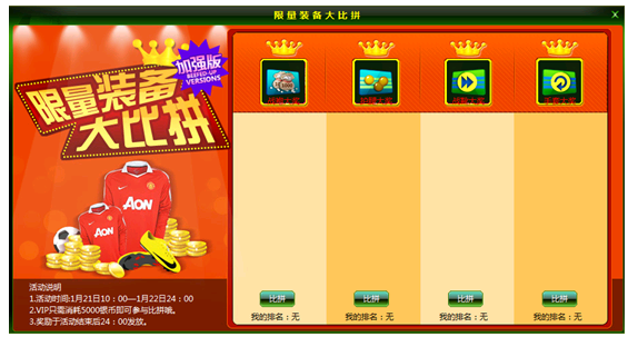 活动内容:在活动期间内,VIP(一代、二代均可)功能的玩家一定要来参与限量装备大比拼活动。把自己6级和7级限量装备拿出来炫耀一下,只需5000银币就可以报名比拼喽~谁的限量装备能夺得排行榜第一呢?榜首第一者奖励银币双倍卡、回豆卡、立即返回卡、跳过次数卡,还有专属球队头像及上线提示呢~