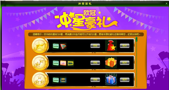活动内容:在活动期间内,玩家通过消费金币达到不同的星级,可领取及购买相应星级大礼。身为VIP或单日消费满100金币即可品尝一星之礼美滋味。日消费6666金币不仅能领取6星礼及抢购6星礼包,并有满星大礼包呈献!