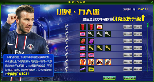 活动内容:在活动期间内,参加“小贝·万人迷”活动。玩家每胜一场小贝副本的比赛除了可抽得常规奖励之外还可以随机获得一个奖杯,玩家可领取对应号码奖杯的奖励。不仅如此,每胜一场小贝副本的比赛更可以获得一个奖杯的激活权限,玩家可花费一定金币立即点亮此奖杯获得奖励哟~当全部奖杯都点亮后,玩家签约小贝副本的巨星贝克汉姆可手动升级初始能力至103。