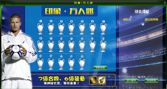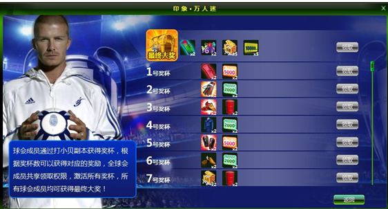 活动内容:活动期间内,“印象·万人迷加强版”活动以球会为单位进行,球会成员每通关一次小贝副本可随机获取并点亮一个对应号码的奖杯,此时球会成员可领取一次对应号码奖杯的专属奖励,更值得期待全部奖杯点亮时的最终大奖呢!奖励领取次数有限喔~