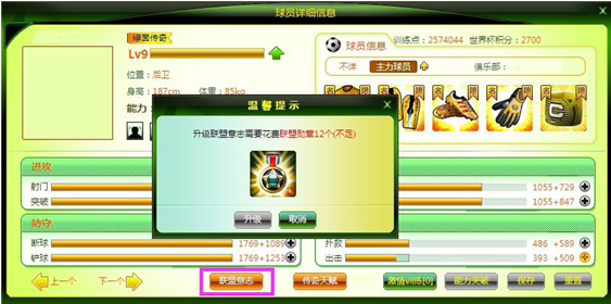 玩家在传奇球员属性图中点击“联盟意志”按钮就可以使用联盟奖章来提升传奇球员初始能力提升的操作。
