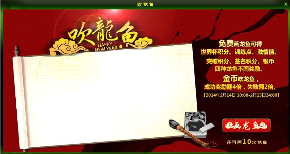 活动内容:活动期间,玩家画龙鱼可获得激情值、突破积分、签名积分、银币,画完龙鱼后,玩家可选择性的花费金币进行吹龙鱼,若玩家吹龙鱼成功则奖励能翻4倍,若玩家吹龙鱼失败则奖励也能翻2倍哟~吉祥龙鱼,要为你掀开元宵节团圆之喜哟~快来参与吧!