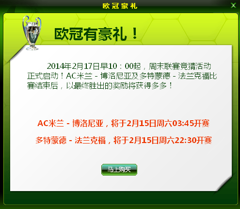 活动内容:活动期间内,玩家在球票商城内利用球票,即可兑换本场赛事的突破积分卡包/世界杯积分包,当AC米兰VS博洛尼亚、多特蒙德VS法兰克福的比赛结束后,若购买的卡包与现实结果相同,则突破积分卡包/世界杯积分包打开后奖励翻倍。超值、限时、限量购买,不容错过!