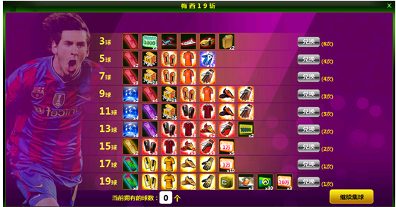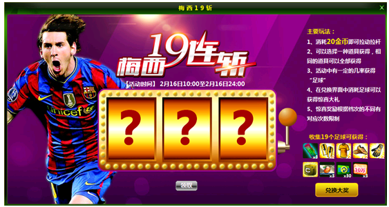 1、玩家参加梅西十九连斩活动费用为20金币/次。如随机摇出3种不同道具,玩家可领取其中一款道具;如随机摇出两个以上相同道具,玩家可选择将相同的道具全部领取。
