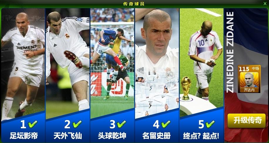 先去完成齐达内职业生涯的光辉任务吧,他将为你带来无尽的荣耀!每完成一个任务,齐达内提升一个品质,任何品质的齐达内都无法被解雇,升级后保留当前级别,训练点返还。突破、世界杯、激情训练等级保留。不论当前齐达内为何品质,升级所消耗与传奇升级消耗相同。未达到传奇品质前的齐达内,不能使用传奇升级的功能。
