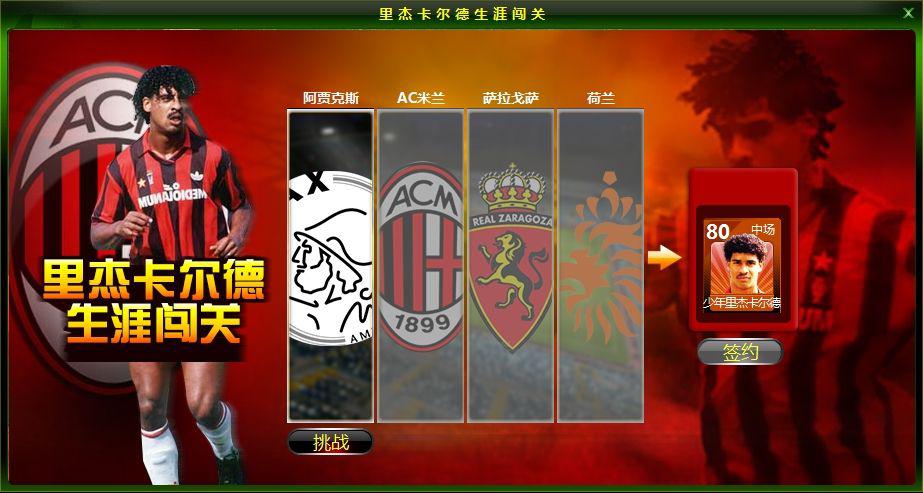 若通关则奖励少年里杰卡尔德的签约权。每赢一场比赛进行翻牌,翻牌奖励内容有:6级合同,成长证书,银币兑换包(中),欧冠之魂。第一次翻牌免费,第二次翻牌消耗60金币,第三次翻牌消耗100金币,第四次翻牌消耗300金币。