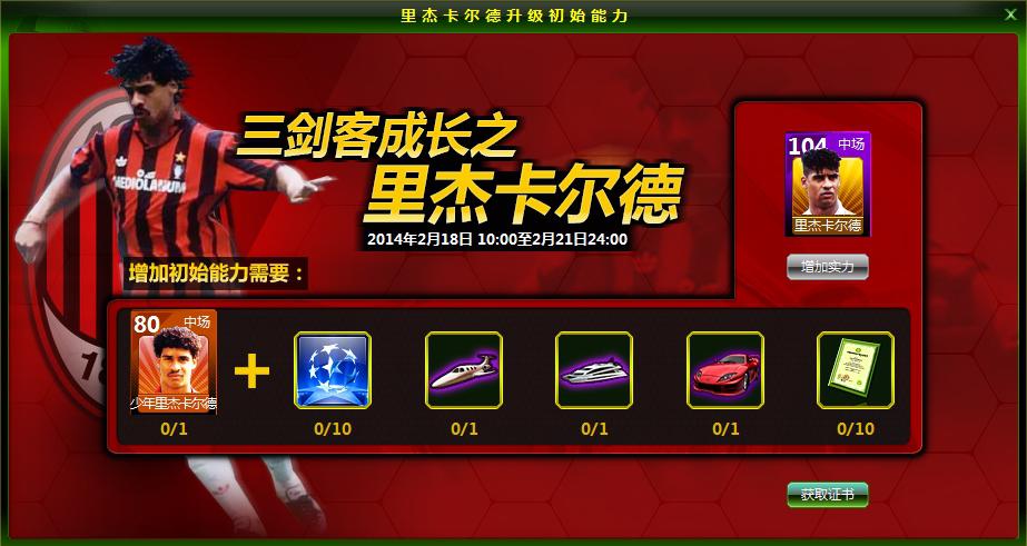 若玩家第一次为队中里杰卡尔德增加初始能力则需要:少年里杰卡尔德*1,欧冠之魂*10,6级飞机*1,6级游艇*1,6级汽车*1,成长证书*10。以此作为基数,此后第几次增加初始实力,就乘以此基数作为收集道具的数量。