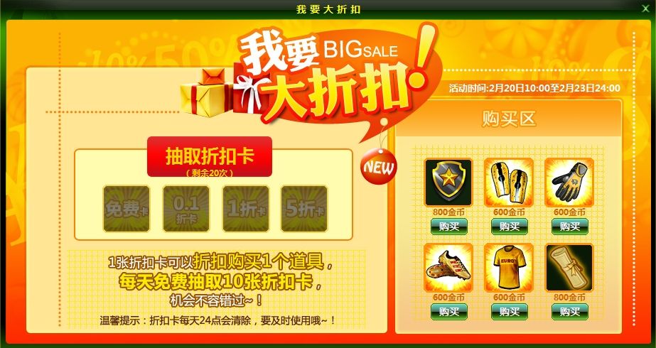 活动内容:在活动期间,玩家参与“我要大折扣”,每个活动日有10次免费抽折扣卡的机会,免费购买卡在等你抽!玩家使用抽到的折扣卡上的折扣来购买活动界面中的道具。如果免费抽折扣卡的机会用完,还可以使用金币来抽折扣卡哟~6款道具等你来超值享受,不仅有0.1折卡,更有免费卡让你痛痛快快买道具!