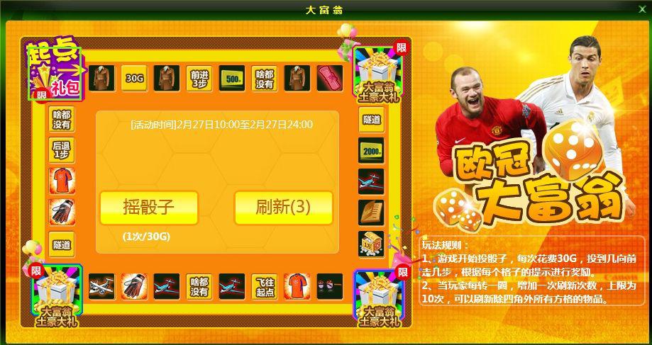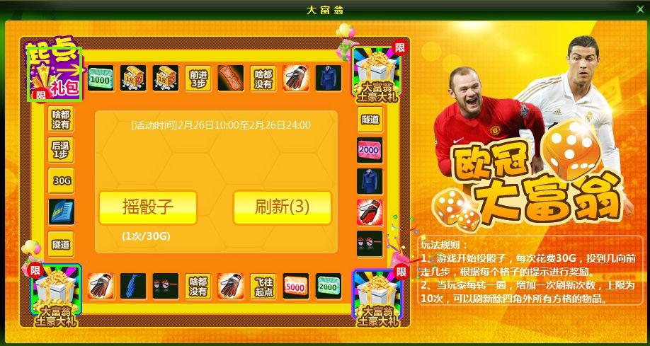 活动内容:在活动期间内,玩大富翁仅需消耗30金币即可掷1次骰子,骰子显示几点就走几步。各种妙礼遍布在你的大富翁梦想之路上。大富翁角落大奖除了起点礼包,其余三个角落大奖每个角都有1-9级合同,高级教练合同9级*3,国王领带9级*1,爵士眼镜9级*1,狂人风衣9级*1,世界杯积分卡10000点*1,紫色激情卡1000点*1,红色激情卡1000点*2,橙色激情卡1000点*3,蓝色激情卡1000点*4,成长证书。