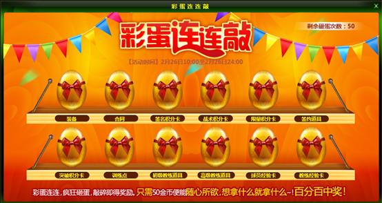 活动内容:在活动期间,小伙伴儿们来玩彩蛋连连敲~12颗彩蛋每敲碎一颗仅需50金币。敲碎蛋蛋即可获得奖励哟~每日敲蛋次数有限,中奖率百分之百哟~你绝对不能错过~