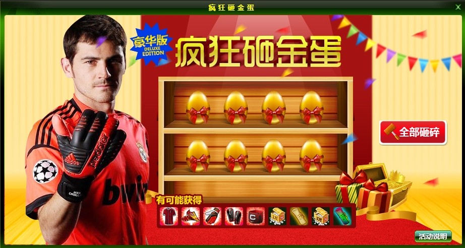 活动内容:在活动期间内,小伙伴儿们快来疯狂砸金蛋~8枚金蛋每砸一枚仅需30金币,即有可能爆出惊喜道具材料。如果你不想一颗一颗砸,更可选择“全部砸碎”,选择全部砸碎8枚金蛋仅需200金币,比一枚一枚砸完8颗金蛋节省40金币哟~银币兑换包(大),重翻次数卡,立即返回卡,训练卡20000点,教练经验卡5000,合同8级,战术积分卡10000点,突破积分卡10000点,签名积分卡10000点等豪礼藏在金蛋中呢~金蛋砸量有限,哈哈~~碎碎出彩!