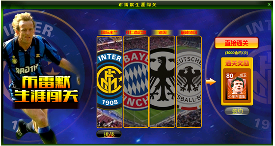 若通关则奖励少年布雷默的签约权。每赢一场比赛进行翻牌,翻牌奖励内容有:6级合同,成长证书,银币兑换包(中),欧冠之魂。第一次翻牌免费,第二次翻牌消耗60金币,第三次翻牌消耗100金币,第四次翻牌消耗300金币。