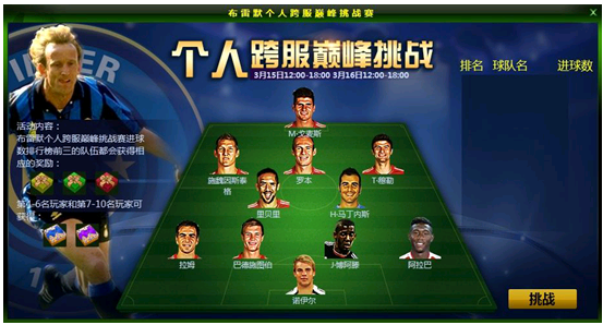 活动内容:在活动期间,球会巅峰挑战赛之布雷默为单平台跨服赛。玩家点击“挑战”按钮即可进行挑战,玩家亦可使用鼓舞来进行挑战。